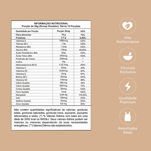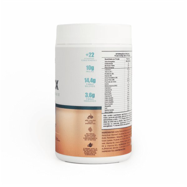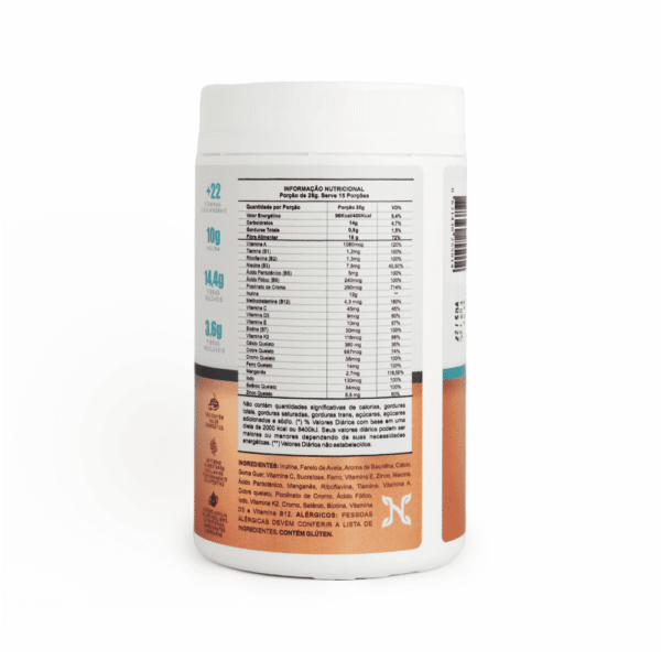 | Composição | lnulina, Farelo de Aveia, Goma Guar, Semente de Chia, Banana Orgânica em pó, Aroma de banana, Vitamina A, Tiamina (B1), Riboflavina (B2), Niacina (B3), Ácido Pantotênico (BS), Ácido Fálico (B9), Picolinato de Cromo, lnulina, Vitamina B12, Vitamina C, Vitamina D, Vitamina E, Biatina (B7), Vitamina K2, Cálcio, Cobre, Cromo, Ferro, Manganês, lodo, Selênio e Zinco. |