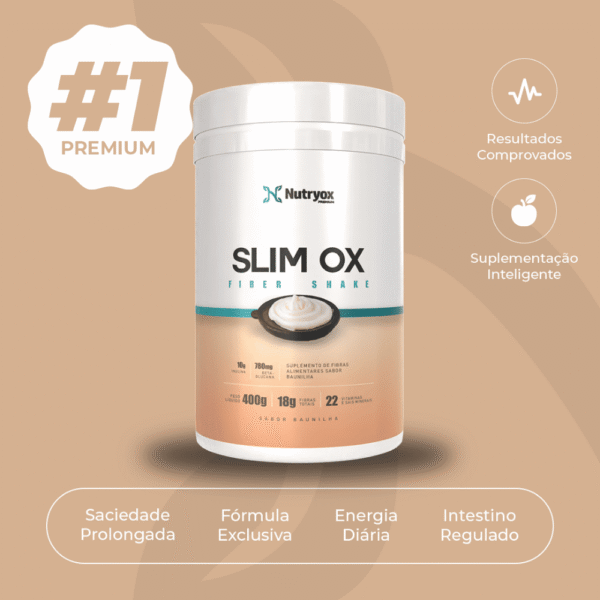O SLIM OX é uma formulação premium clínica que além das Fibras Alimentares em alta concentração possui mais 22 Vitaminas e Sais Minerais essenciais para o combate à Obesidade, Diabetes Tipo 1,Diabetes Tipo 2, Hiperglicemia, Pressão Arterial Elevada, Constipação, Diarreia, Câncer de Cólon e promove a melhoria da Microbiota Intestinal, melhorias dos Movimentos Intestinais, auxilia no aumento da Imunidade, Disposição, Osteoporose, Inflamações, aumento do Libido, Regulação da Tireoide, melhoria das Funções Cerebrais e combate às Doenças Cardiovasculares.